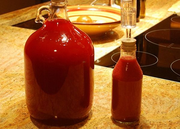 - اخلط المربى المُخمّر مع الماء بنسبة ١:١، مع إضافة الزبيب والسكر (اختياري). يُنصح باستخدام زجاجة زجاجية بسعة ٥ لترات على الأقل، أو عدة مرطبانات سعة ثلاثة لترات مملوءة بنسبة ٢/٣.