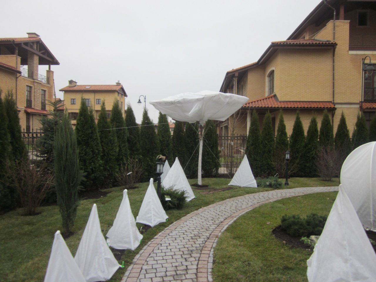 لحماية النباتات من البرد والصقيع، يُنصح باستخدام مواد تغطية حديثة غير منسوجة: أقمشة سبونبوند، وجيوتكستايل، وجوت، ولوتراسيل، وأقمشة أوبيرنيت وأوداتشا 60. يُعدّ القماش الرقيق بكثافة 17 غ/م² مناسبًا لعزل أزهار الكوبية الخشنة وأوراق البلوط، وورود الحدائق، وزنابق الكالا، وزهر العسل، والبرقوق الصيني، وغيرها من نباتات الزينة التي تنمو في شبه جزيرة القرم ومنطقة كوبان. أما في المناطق الوسطى، بما في ذلك منطقة موسكو، فيُفضّل استخدام مادة أكثر كثافة. على سبيل المثال، يُستخدم الألياف الزراعية بكثافة 42 و60 غ/م² لعزل أشجار الجوز الصغيرة، وأصناف الخوخ العمودي، وأشجار الكرز اليابانية.