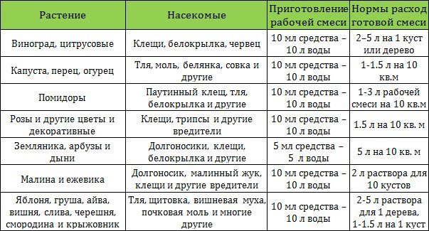 رش توت العليق والكشمش بهذا المنتج يُساعد على التخلص من سوس العنكبوت والسوس والعث. كما يُمكن استخدامه لعلاج الفراولة المتضررة من الذباب الأبيض وسوس العنكبوت. في هذه الحالة، استخدم 5 لترات من المنتج لكل 10 أمتار مربعة. يُمكن رش المنتج أيضًا على كروم العنب. للقيام بذلك، خفف 10 مل من المُركز في 10 لترات من الماء. القاعدة الأساسية هي التأني، وعالج كل ورقة بعناية.