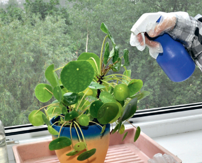 يمكن استخدام هذا المحلول على النباتات المنزلية. وهو فعال حتى في حال فشل العلاجات الأخرى. يقضي على حشرات المن، والحشرات القشرية، والذباب الأبيض، والبق الدقيقي. يُفضل معالجة الزهور في الصيف، حيث يجب تهوية الغرفة جيدًا بعد ذلك. ضع الأصص على الأرض أو على طاولة مغطاة بالصحف. يجب ألا تلامس الزهور بعضها البعض.